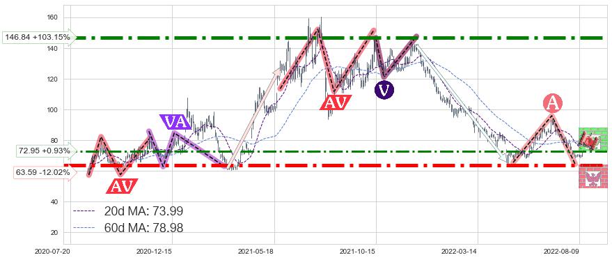 ♘ 阻力价格位146.84,可信任强度97.20%,距离最后交易2022-08-12形成的收盘价格72.28相差 +103.15%