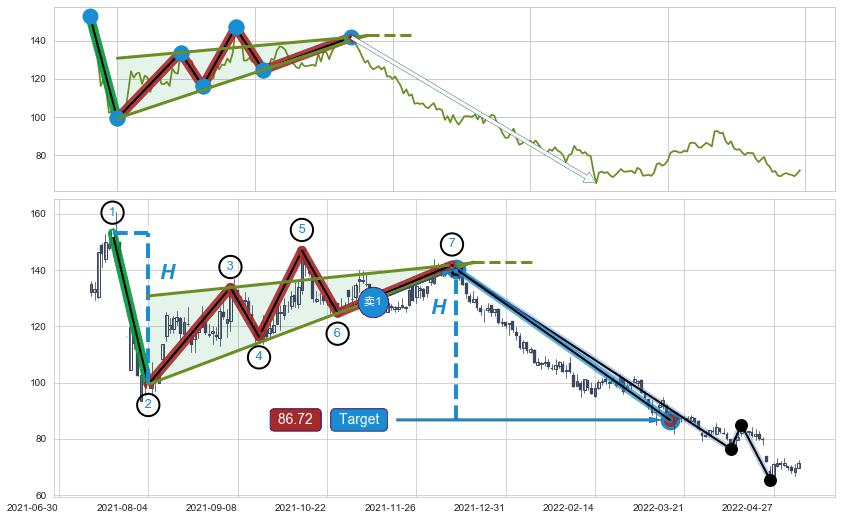 ➢ 最小中继整理跌幅→𝐇: 53.77 (𝐇楔型旗杆的长度:楔型起点→顶点)