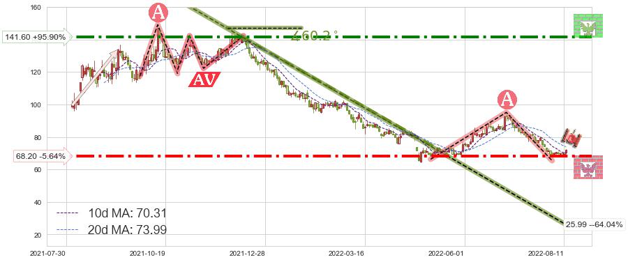 ♘ 支撑价格位68.20,可信任强度74.09%,距离最后交易2022-08-12形成的收盘价格72.28相差 -5.64%
