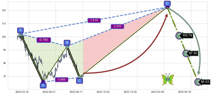 ➣ 未完成【蝴蝶】形态起点X: 2022-02-23, 已到达C点: 2022-08-03, 预测最终D点: 2023-03-17, 共272交易日