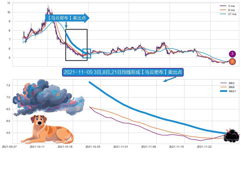 ⚀ 2021-10-21日-2021-11-25日显现 3日-8日-21日均线 【乌云密布】卖出点 看空信号,后市看跌,卖出