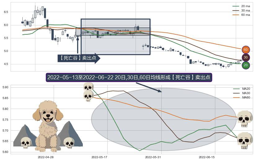 ⚀ 2022-05-16-日至2022-06-22-日显现 20日-30日-60日均线 【死亡谷】卖出点 看空信号,后市看跌,卖出