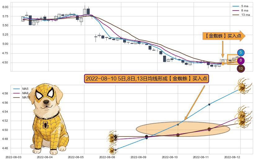 ⚀ 2022-08-10日显现 5日-8日-13日均线 【金蜘蛛】买入点 看多信号,后市看涨,买入