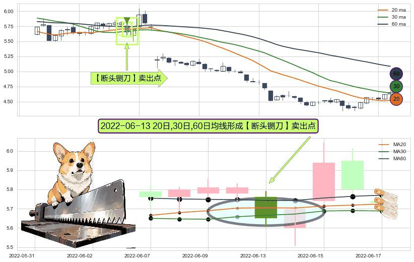 ⚀ 2022-06-13日显现 20日-30日-60日均线 【断头铡刀】卖出点 看空信号,后市看跌,卖出