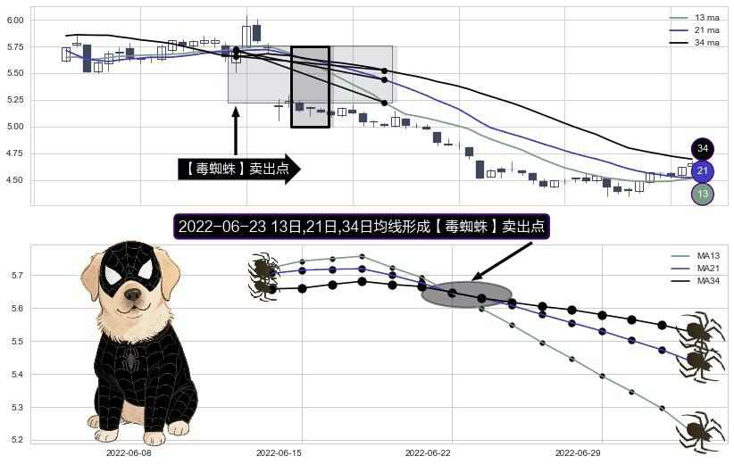 ⚀ 2022-06-23日显现 13日-21日-34日均线 【毒蜘蛛】卖出点 看空信号,后市看跌,卖出