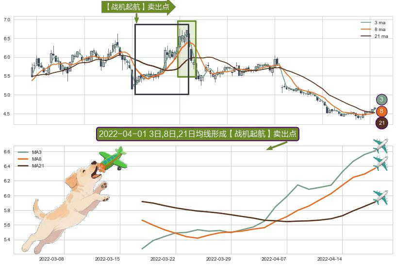⚀ 2022-03-17日-2022-04-19日显现 3日-8日-21日均线 【战机起航】卖出点 看空信号,后市看跌,卖出