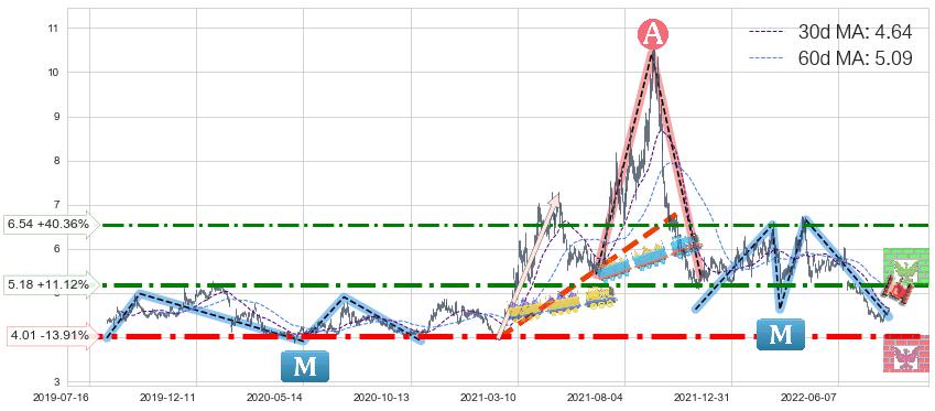 ♘ 支撑价格位4.01,可信任强度96.17%,距离最后交易2022-08-12形成的收盘价格4.66相差 -13.91%