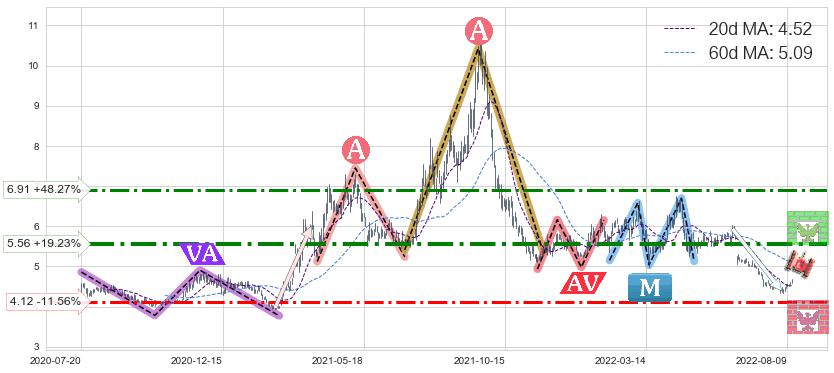 ♘ 阻力价格位5.56,可信任强度80.80%,距离最后交易2022-08-12形成的收盘价格4.66相差 +19.23%