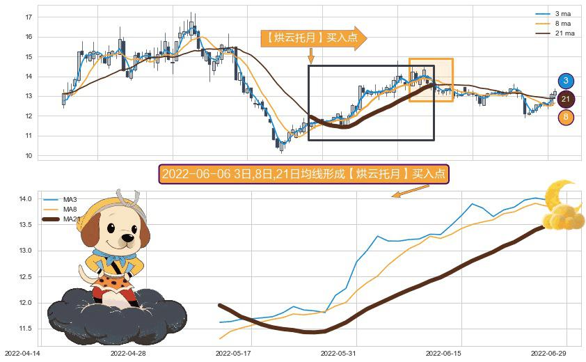 形态多维评估: ⚀ 2022-05-12日-2022-06-28日显现 3日-8日-21日均线 【烘云托月】买入点 看多信号,后市看涨,买入