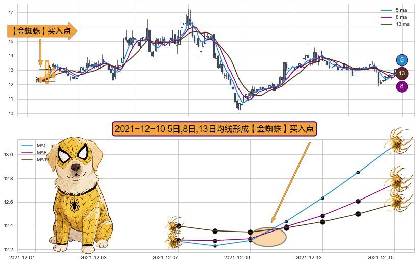 形态多维评估: ⚀ 2021-12-10日显现 5日-8日-13日均线 【金蜘蛛】买入点 看多信号,后市看涨,买入