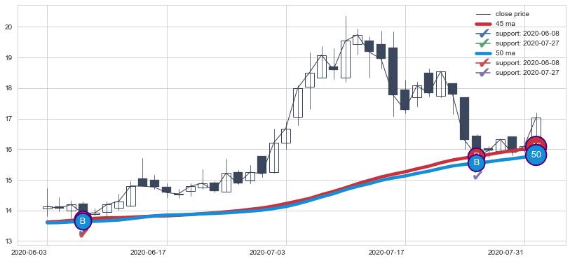 上涨趋势2020-06-03-2020-08-03,均线50, 45确认关键支撑2处