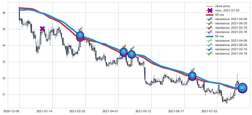 下跌趋势2020-12-09-2021-08-13,均线50, 45确认关键阻力4处