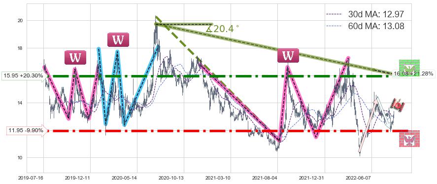 ♘ 阻力价格位15.95,可信任强度94.08%,距离最后交易2022-08-12形成的收盘价格13.26相差 +20.30%