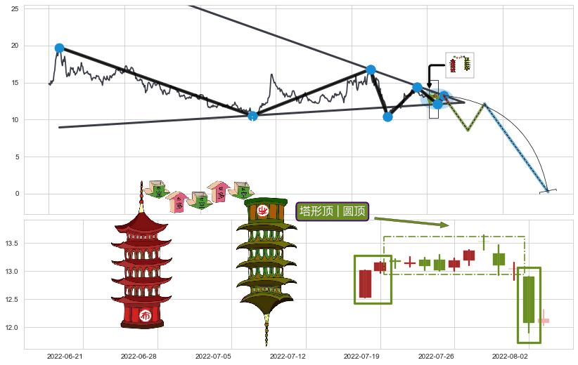 | 24 🅚:塔形顶 | 圆顶 ➕ 🌊:波浪理论下跌5浪延续:猜想C点强阻力小反弹终止,猜想保持下跌5浪方向下行(均值回复后大周期继续趋势跟踪) ☞ 看空信号 ⇥ 【🅚线】交织【图形】⇥ 综合量化分数: 37 | > |