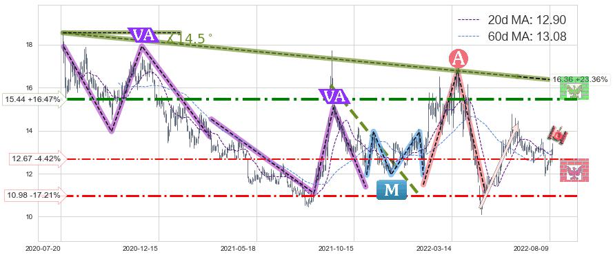 ♘ 阻力价格位15.44,可信任强度79.61%,距离最后交易2022-08-12形成的收盘价格13.26相差 +16.47%