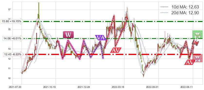 ♘ 阻力价格位14.06,可信任强度64.10%,距离最后交易2022-08-12形成的收盘价格13.26相差 +6.01%