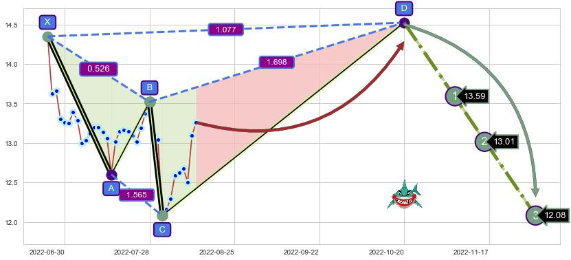 ➣ 未完成【鲨鱼】形态起点X: 2022-06-24, 已到达C点: 2022-08-02, 预测最终D点: 2022-10-20, 共85交易日