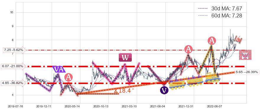 ♘ 支撑价格位4.85,可信任强度99.00%,距离最后交易2022-08-12形成的收盘价格7.68相差 -36.82%