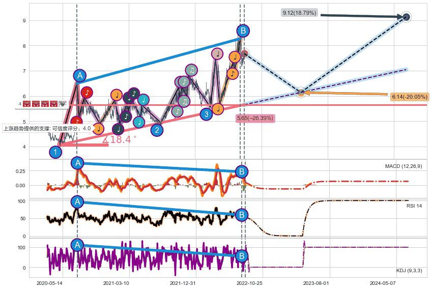 ♘ 在最后的上升阶段2020-04-28至2022-08-12存在 持续未破位的支撑位 ,支撑价格5.65,支撑可信任强度84.09%,其距离最后价格7.68相差 -26.39%