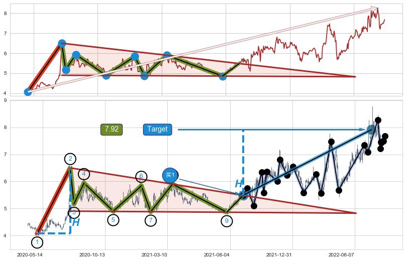 ➢ 最小中继整理涨幅→𝐇: 3.041 (高点逐步降低斜边第一阻力点②与支撑边垂直距离)
