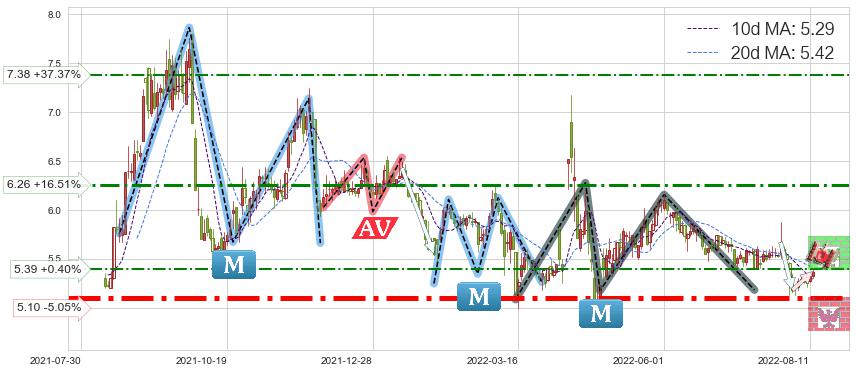 ♘ 阻力价格位5.39,可信任强度33.31%,距离最后交易2022-08-12形成的收盘价格5.37相差 +0.40%