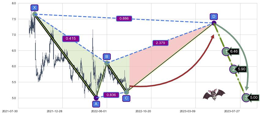 ➣ 未完成【蝙蝠】形态起点X: 2021-09-23, 已到达C点: 2022-08-03, 预测最终D点: 2023-05-05, 共405交易日