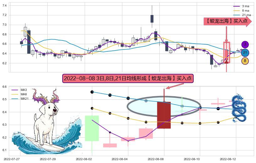 ⚀ 2022-08-08日显现 3日-8日-21日均线 【蛟龙出海】买入点 看多信号,后市看涨,买入