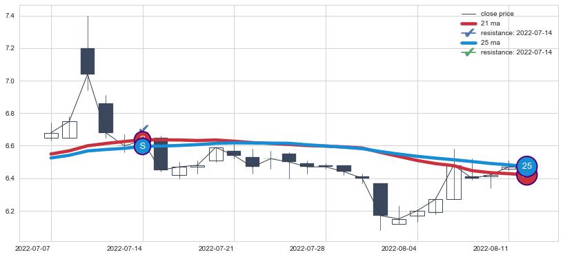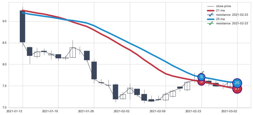⚄ 价格在均线遇到阻力后再次向下回落了【极短】距离, 第⑦卖出点 阻力效果【等待验证】