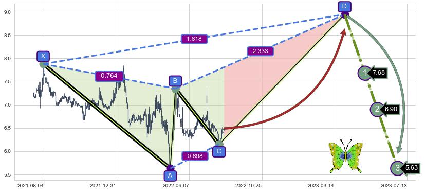 ➣ 未完成【蝴蝶】形态起点X: 2021-08-03, 已到达C点: 2022-08-03, 预测最终D点: 2023-04-03, 共416交易日