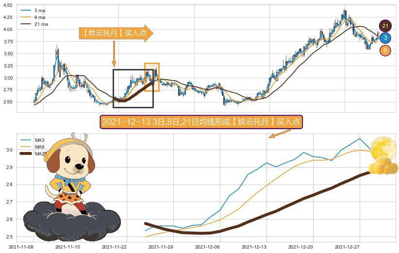 ⚀ 2021-11-24日-2021-12-29日显现 3日-8日-21日均线 【烘云托月】买入点 看多信号,后市看涨,买入