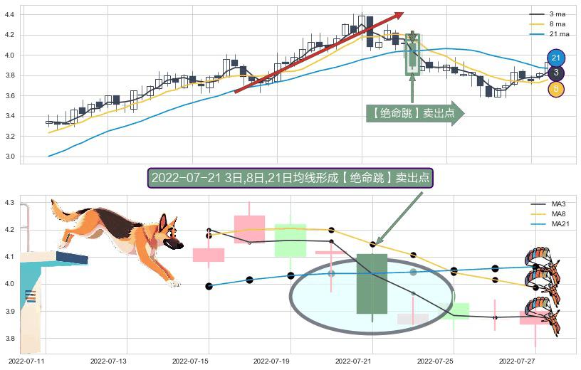 ⚀ 2022-07-21日显现 3日-8日-21日均线 【绝命跳】卖出点 看空信号,后市看跌,卖出