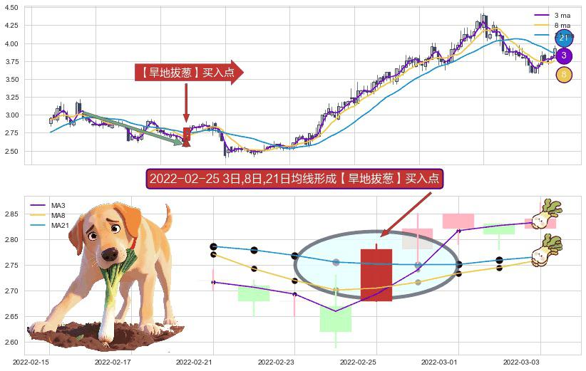 ⚀ 2022-02-25日显现 3日-8日-21日均线 【旱地拔葱】买入点 看多信号,后市看涨,买入
