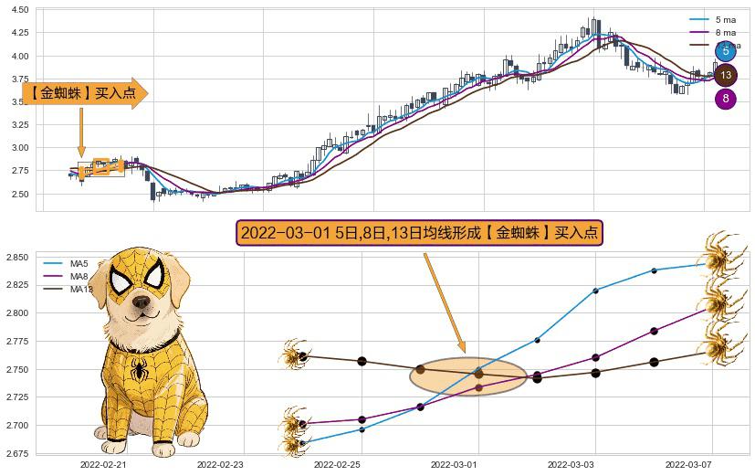 ⚀ 2022-03-01日显现 5日-8日-13日均线 【金蜘蛛】买入点 看多信号,后市看涨,买入