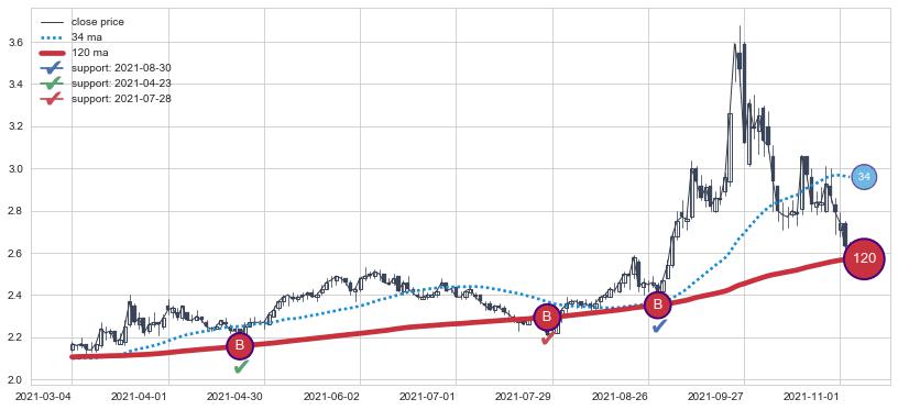 ⚁ MA3和MA8走势平行,且始终保持在短距离内,MA21始终在短中期均线下方,与短中期均线保持一定的距离,微微上行