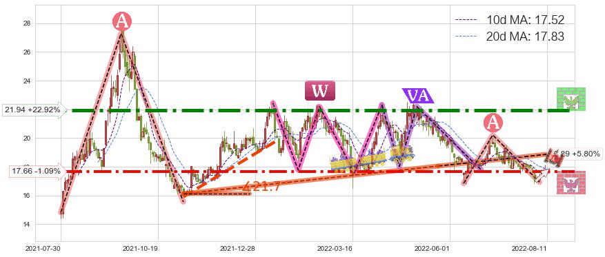 ♘ 支撑价格位17.66,可信任强度83.49%,距离最后交易2022-08-12形成的收盘价格17.85相差 -1.09%