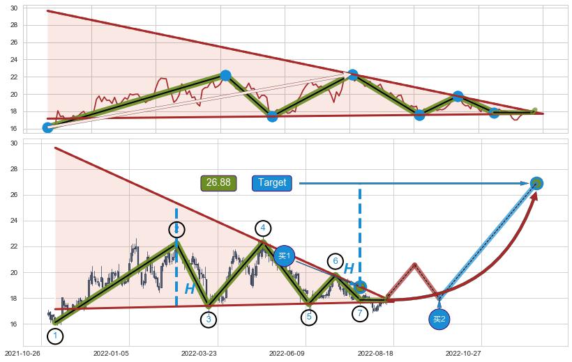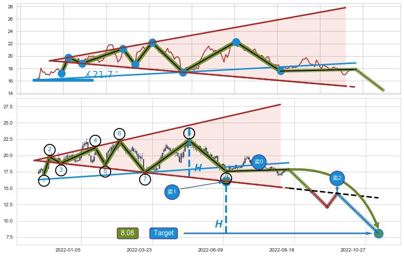 ➢ 最小反转跌幅→𝐇: 7.97 (逐步抬高阻力斜边最后的阻力点⑧与支撑边垂直距离)