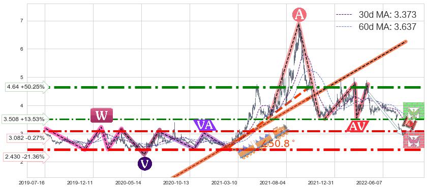 ♘ 阻力价格位4.64,可信任强度88.00%,距离最后交易2022-08-12形成的收盘价格3.090相差 +50.25%