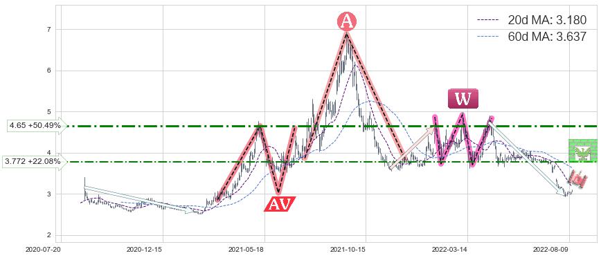 ♘ 阻力价格位3.772,可信任强度41.76%,距离最后交易2022-08-12形成的收盘价格3.090相差 +22.08%