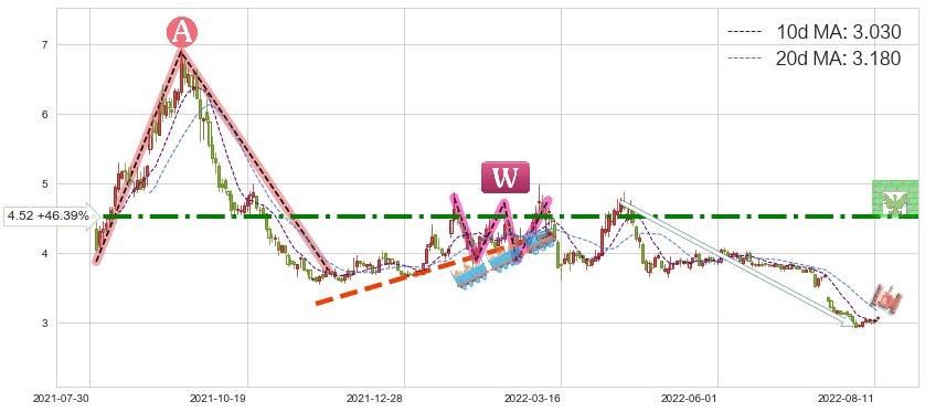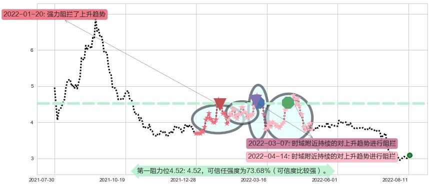 ♘ 阻力价格位4.52,可信任强度73.68%,距离最后交易2022-08-12形成的收盘价格3.090相差 +46.39%