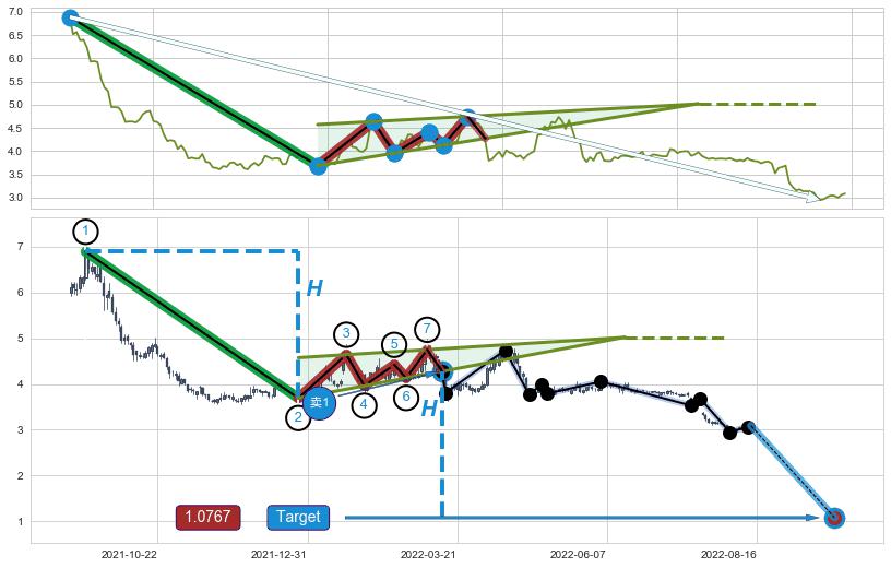 ➢ 最小中继整理跌幅→𝐇: 3.200 (𝐇楔型旗杆的长度:楔型起点→顶点)