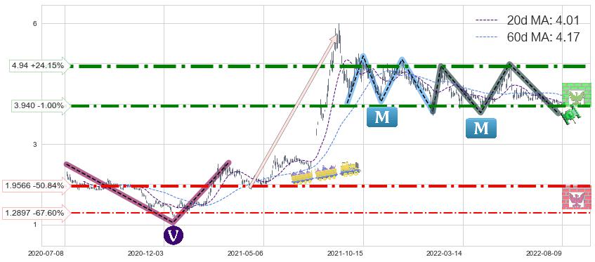♘ 阻力价格位4.94,可信任强度93.67%,距离最后交易2022-08-12形成的收盘价格3.980相差 +24.15%