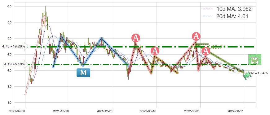 ♘ 阻力价格位4.75,可信任强度91.89%,距离最后交易2022-08-12形成的收盘价格3.980相差 +19.26%