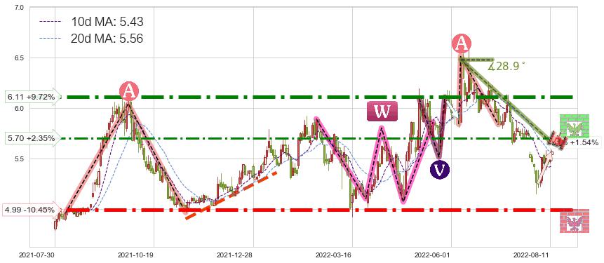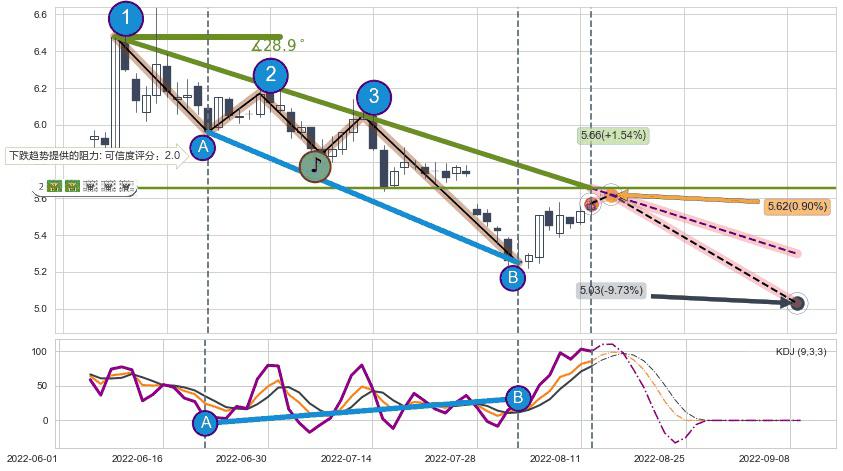♘ 阻力价格位5.70,可信任强度61.68%,距离最后交易2022-08-12形成的收盘价格5.57相差 +2.35%