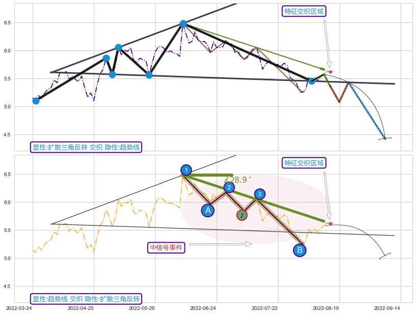 ➣ 【未确认突破,预测即将形成突破】【扩散】三角形反转起点:2022-03-25, 预测突破点:2022-08-16,形态共97交易日