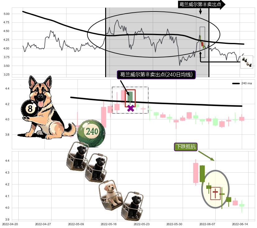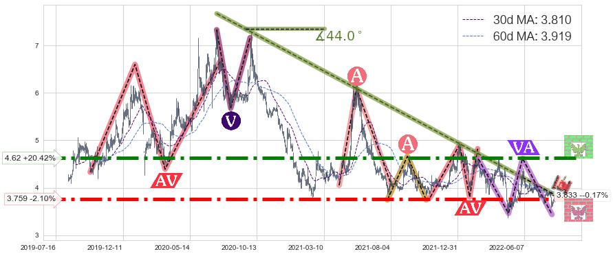 🦴 长线均值回复组合短线趋势跟踪[强阻力信号]2020-07-13-2022-05-31下跌趋势依然成立(下跌趋势跟踪依然存在),短线价格略微上行反弹(均值回复猜想),即将接近下跌趋势提供的未破位阻力价格:3.833。