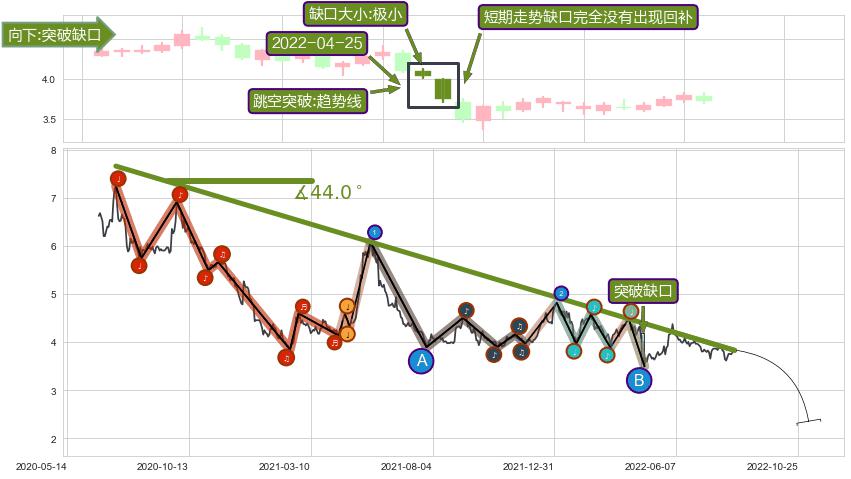 ➢ 【多方力量耗尽,空方打破攻守平衡点】下降三角形中继整理, 已在2022-04-25突破【支撑】颈线 3.890 →演变成下降通道