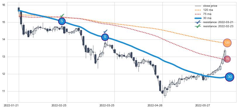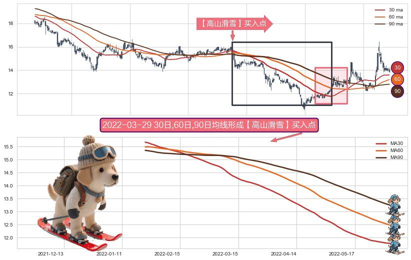 ⚀ 2022-01-21日-2022-06-02日显现 30日-60日-90日均线 【高山滑雪】买入点 看多信号,后市看涨,买入