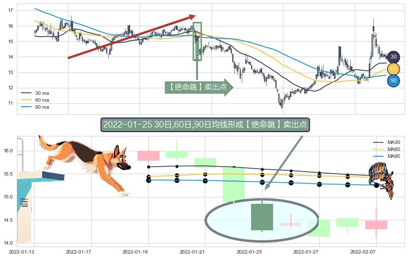⚀ 2022-01-25日显现 30日-60日-90日均线 【绝命跳】卖出点 看空信号,后市看跌,卖出