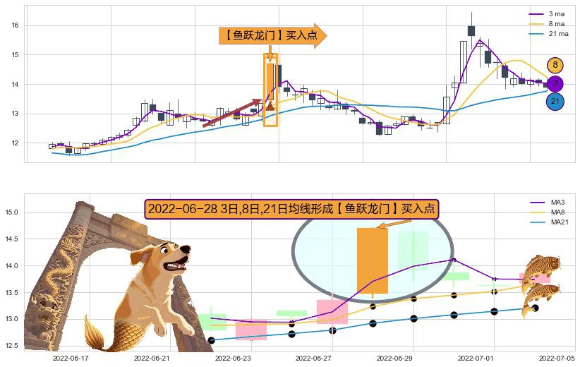 ⚀ 2022-06-28日显现 3日-8日-21日均线 【鱼跃龙门】买入点 看多信号,后市看涨,买入