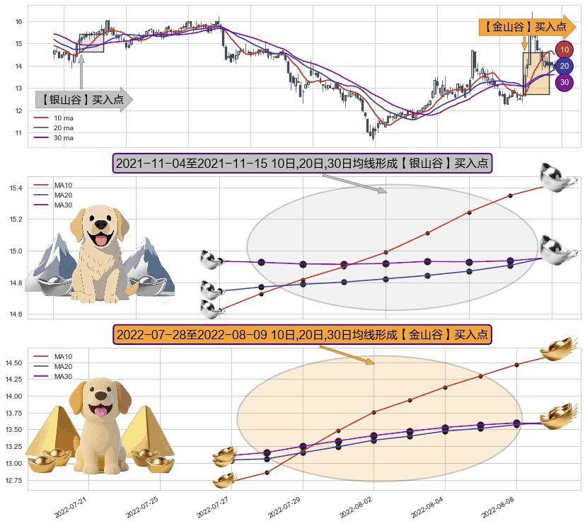 ⚃ 【金山谷】买入点短期均线上穿中长均线,中期均线上穿长期均线形成的三个交叉中仅有两个 黄金交叉